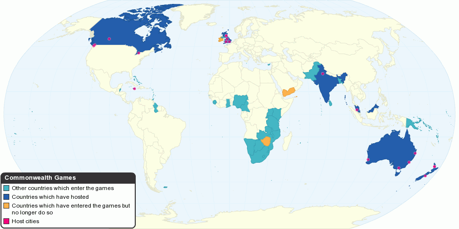 This map shows Commonwealth games - countries which have participated, and locations of the games. The Commonwealth Games is an international, multi-sport event which is held every four years and features competitions involving thousands of elite athletes from members of the Commonwealth of Nations.