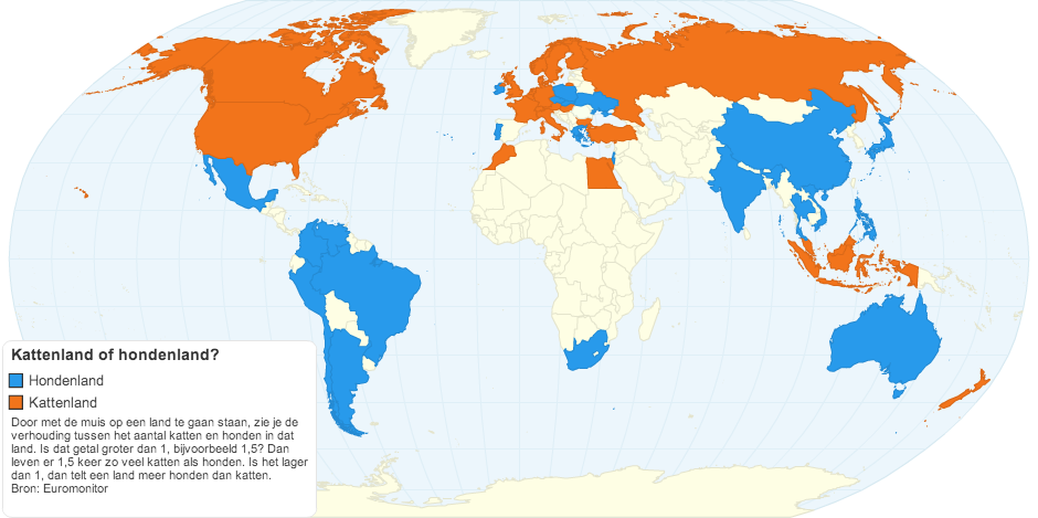De verhouding tussen het aantal katten en het aantal honden in een land. Welke landen zijn kattenlanden, en welke landen zijn hondenlanden?