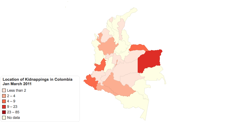 Map showing the location of kidnappings in Colombia between January and March of 2011