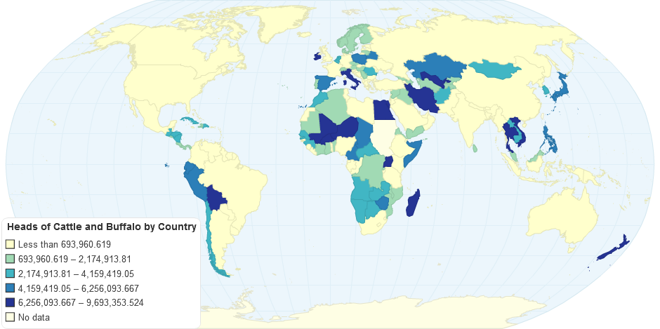 Number of heads of cattle and buffalo by country (average 1993 - 2013)