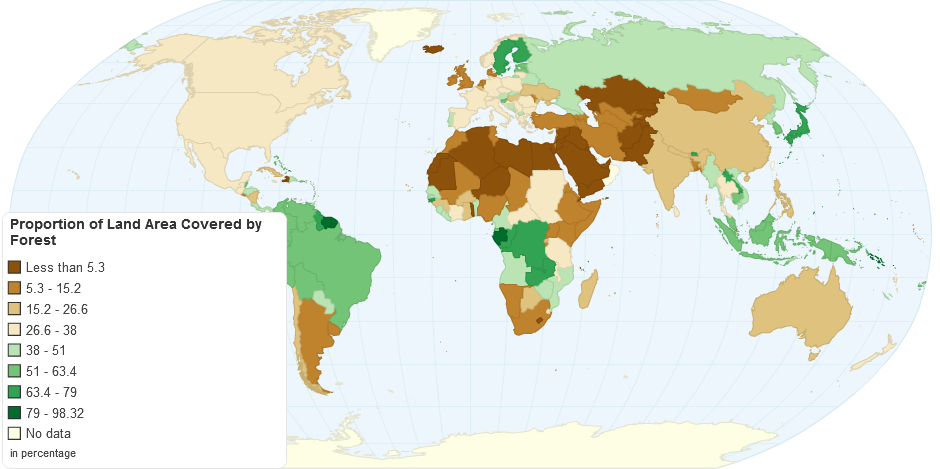 This map shows proportion of forest area to total land area (expressed as a percentage).