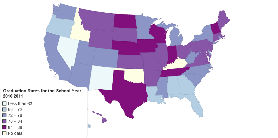 This map shows the graduation rates for the United States in the year 2010 - 2011.