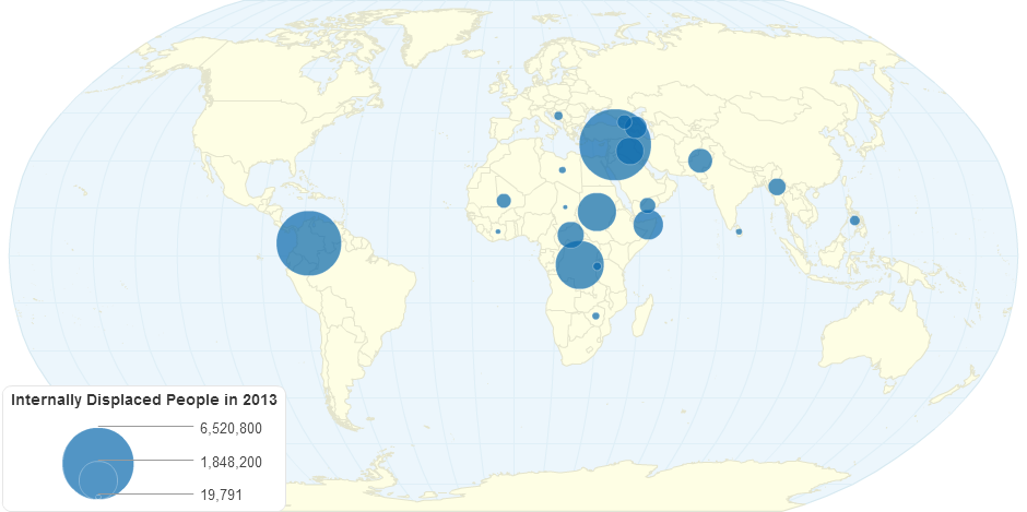Proportional Symbol Map showing the total amount of IDPs per country in 2013.