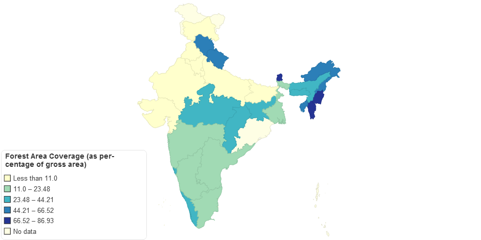 Map showing forest cover of different Indian states as per-centage of gross area of states.