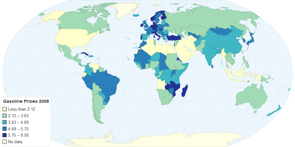 The visualization shows the price of one gallon of gasoline (in US Dollars) in various countries of the world.