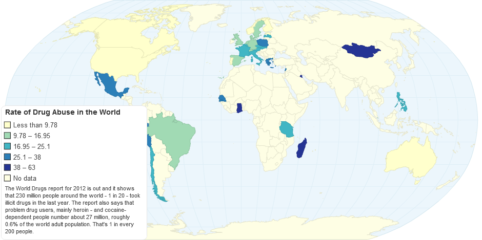 The World Drugs report for 2012 is out and it shows that 230 million people around the world - 1 in 20 of us - took illicit drugs in the last year. The report also says that problem drug users, mainly heroin - and cocaine-dependent people number about 27 million, roughly 0.6% of the world adult population. That's 1 in every 200 people.