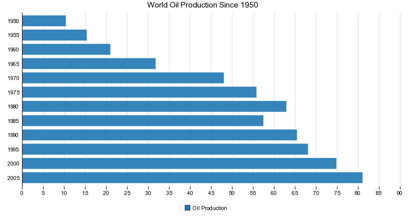 Chart showing an increase in world oil production. Oil production indicates the increase in demand and thereby the consumption of oil . And therefore indicates and increase in pollution leading to global warming