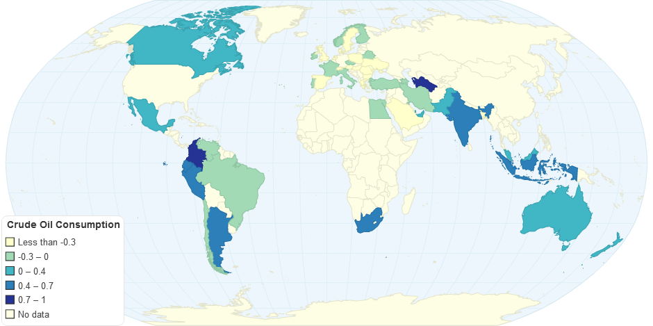 The data shows the consumption of crude oil by various countries. Along with it, it shows the the amount temperature change in the country due to the consumption of crude oil. As we can see, Columbia and Turkmenistan have maximum temperature change.