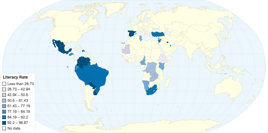 Adult (15+) literacy rate (%). Total is the percentage of the population age 15 and above who can, with understanding, read and write a short, simple statement on their everyday life. This map is illustrated based on the data from the World Bank.