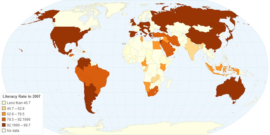 The map is based on the databbase of World Bank and the world factbook, which describe the literacy rate in 2007.