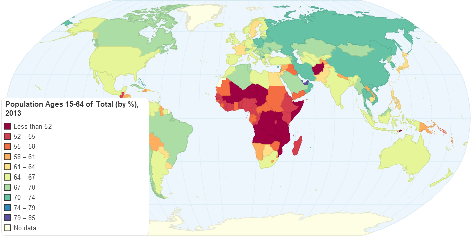 Total population between the ages 15 to 64 is the number of people who could potentially be economically active. Population is based on the de facto definition of population, which counts all residents regardless of legal status or citizenship--except for refugees not permanently settled in the country of asylum, who are generally considered part of the population of the country of origin.