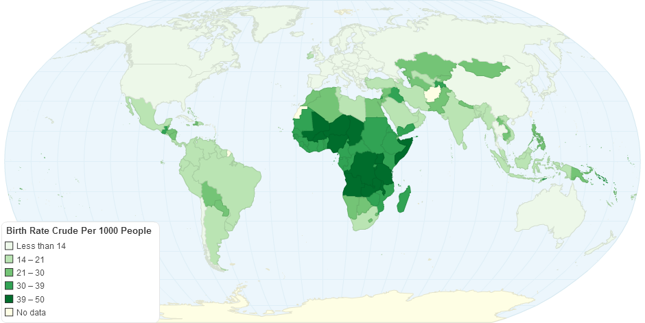 The map illustares the world birth rate per 1000 people in 2012 based on the data from World Bank.
