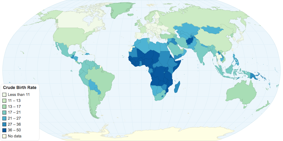 it is a map that displays world wide crude birth rate data, including 201 countries.