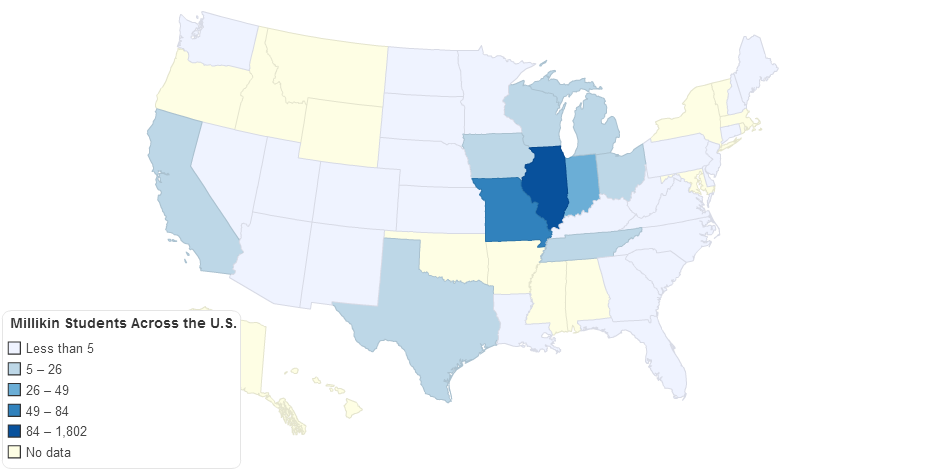 A visual collection of data representing the states from which students come to attend Millikin University. Valid as of the 2014-2015 school year.
