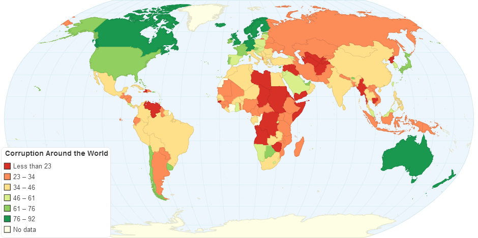 This chart shows Corruption Perceptions Index (CPI) around the world. The CPI index score on a scale from 100 (very clean) to 0 (highly corrupt)