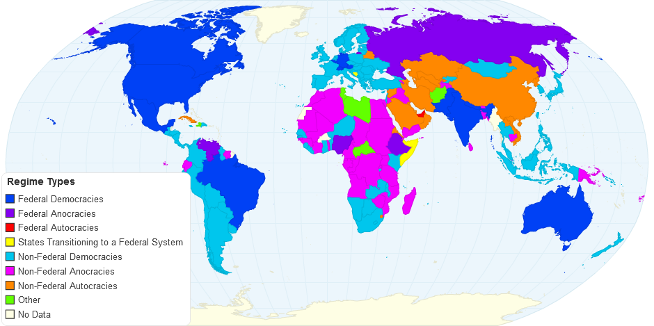Regimes around the World based on Polity IV regime type values and CIA assesments of federalism.