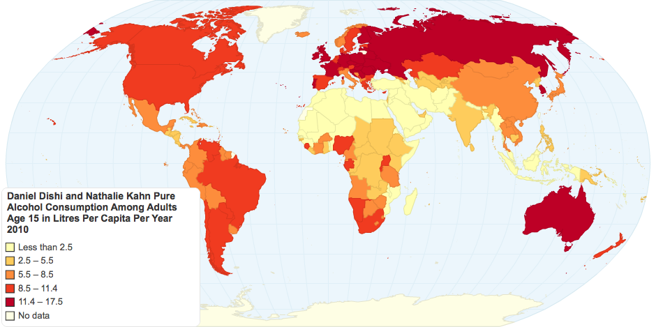 Daniel Dishi and Nathalie Kahn Pure alcohol consumption among adults (age 15+) in litres per capita per year, 2010, http://en.wikipedia.org/wiki/List_of_countries_by_alcohol_consumption, viewed 15th December, 2014.