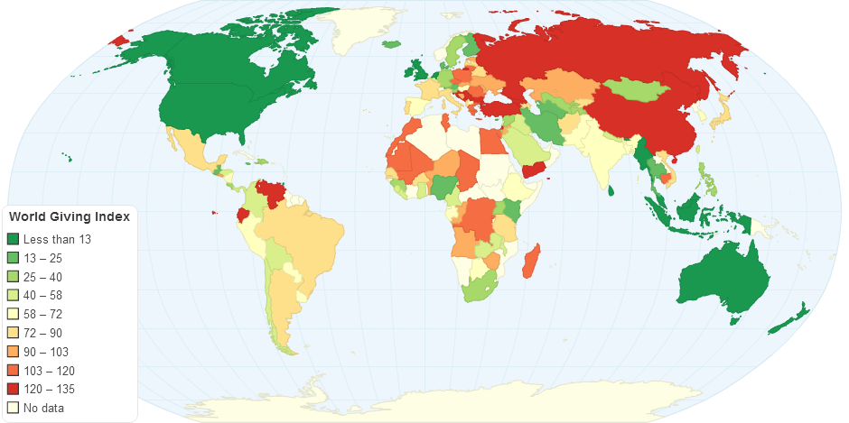 This map shows World Giving Index in 135 countries around the world. The World Giving Index allows us to establish a rounded view of charitable behaviour worldwide reflecting the fact that being charitable is about more than simply giving money.