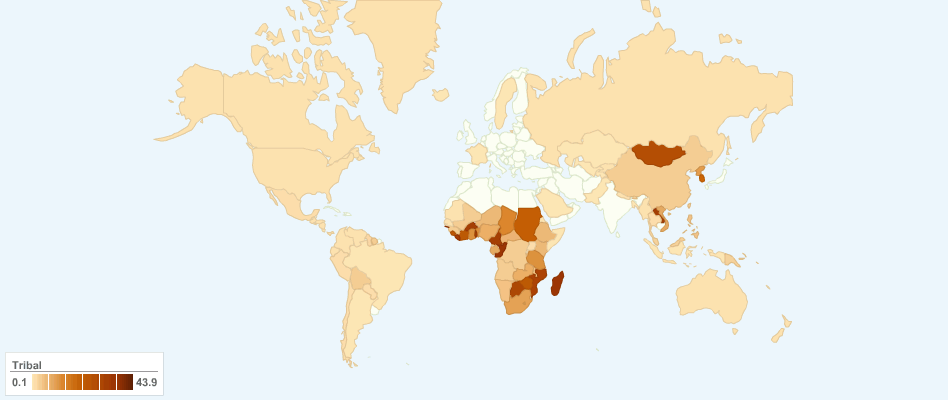 This chart shows current Tribal religion followers by Country. Tribal religion includes Ethnoreligionists, Animists, Shamanists, African Traditional and African Diasporic Religions.