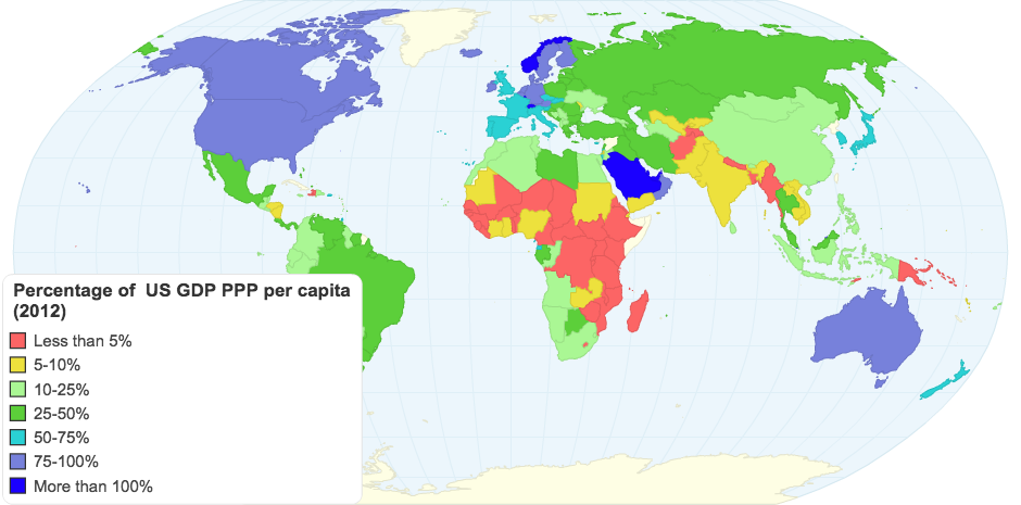 This visualization accounts for the percentage of Gross Domestic Product (Purchasing Power Parity) each country has in relation to the US. Data are collected from the World Bank's "World Development Indicators" for 2012. The percentage is calculated by taking national GDP PPP per capita and dividing this number by the GDP PPP per capita of the US. Argentina and Myanmar are estimates taken from outside sources.