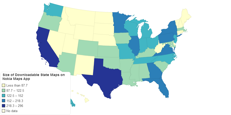 The Nokia Maps app allows users to download maps for viewing offline. I noticed the the size of the maps are not necessarily a function of population or land area, and thought this map would be an interesting comparison.