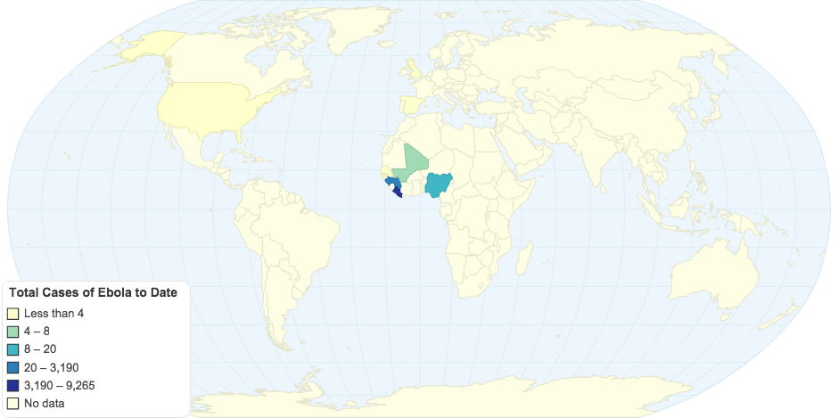 As of March 1, 2015, the Centers for Disease Control reported these countries as having reported cases of ebola.