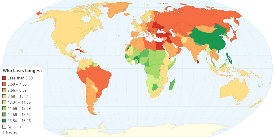 This Map shows how long on average Porhub users around the world spend on the site by country. The data used was compiled over the Fall of 2014.