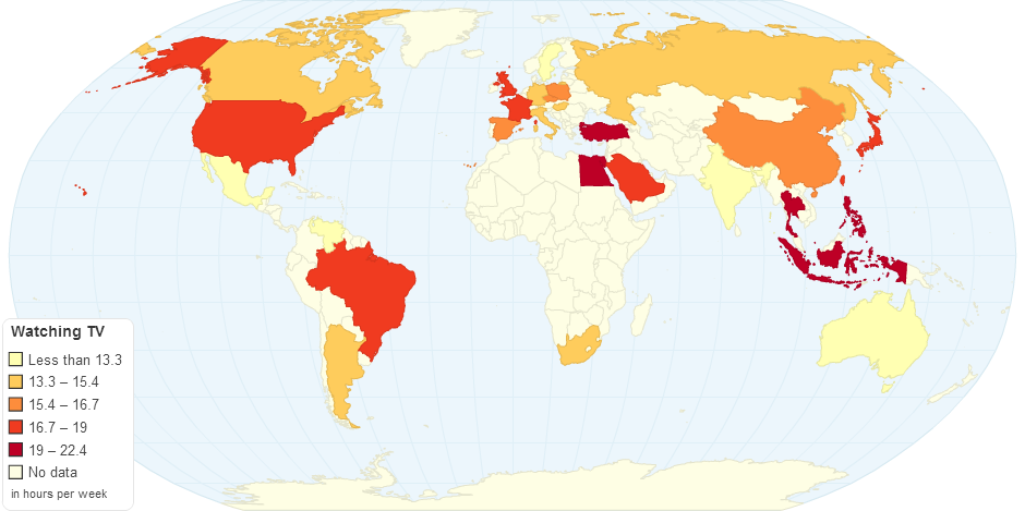 Consumers in Thailand report the most time each week in front of the television at 22.4 hours per week, followed closely by the Philippines at 21.0, Egypt at 20.9 and Turkey at 20.2 hours. Mexicans report watching the least amount of television at 11.6 hours per week, followed by Venezuelans at 11.9 and Swedes at 12.3.