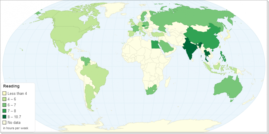 This map shows the average weekly hours consumers report spending reading. Consumers in India are most likely to spend time reading, at an average of 10.7 hours per week, followed by consumers in Thailand and China (at 9.4 hours and 8 hours per w ...