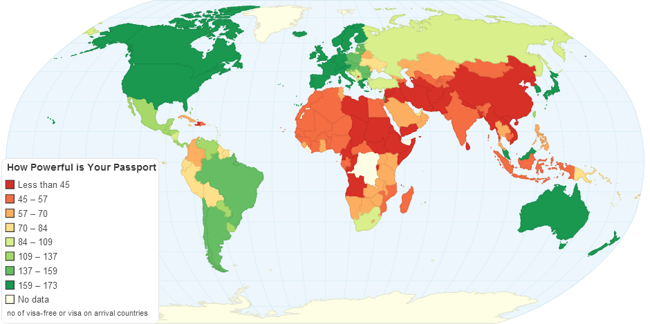 This map shows passport holders whose countries are granted visa-free access (or receive upon arrival) to the number of countries.