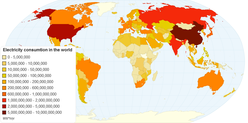 A visualization of statistics from Wikipedia showing the electricity consumtion in the world [MW*h/yr] (2014).