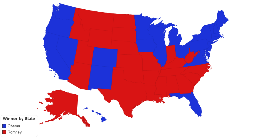 2012 United States presidential election results by state, per a Federal Election Commission report.