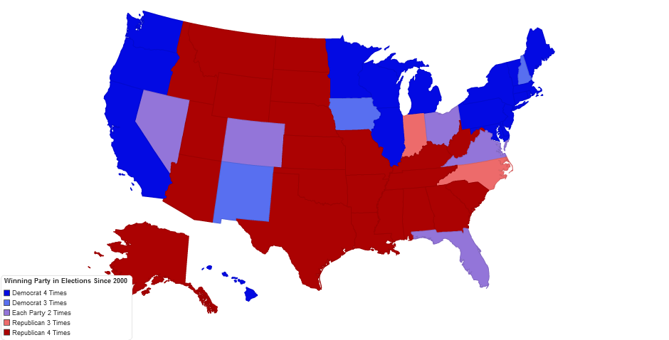 Shows the number of times Democrats and Republicans won each state during the four presidential elections results held in the United States from 2000 to 2012. Data from Federal Election Commission reports.