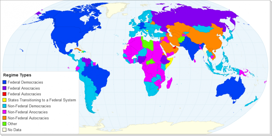 Regimes around the World based on Polity IV regime type values and CIA assesments of federalism.