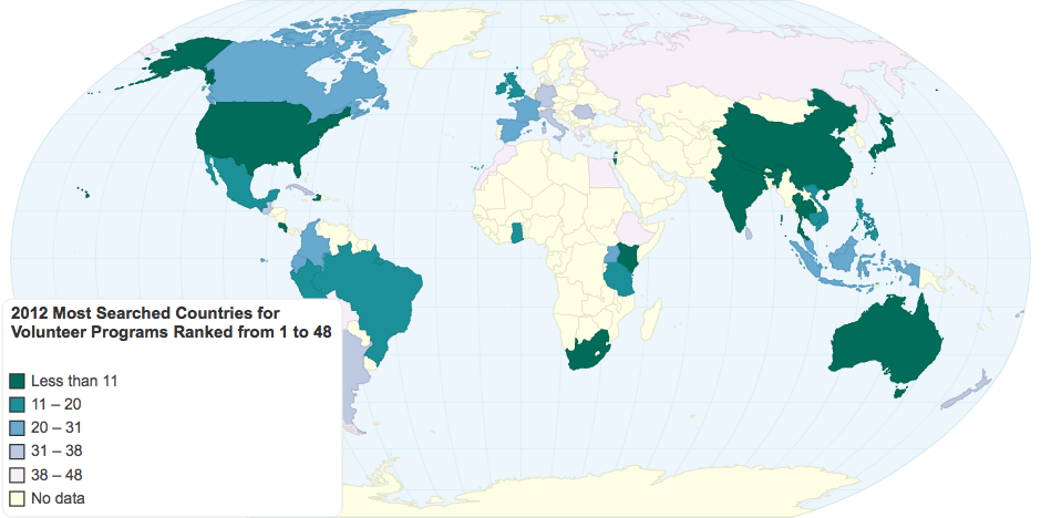 Where do volunteers want to allocate their time abroad? This interactive map shows volunteer interest in different countries based upon search data provided by Go Overseas, a comprehensive volunteer program review site, in a 2012 Official Volunteer Abroad Report. The report used Google Keyword Tool and reports on global volunteering to compile its information. The rank of the countries, numbered from 1 to 48, show varying levels of interest in volunteer work of a given country. The report postulates different reasons behind the high interest in volunteer work in different countries. It identifies disaster relief as a major motivator for volunteers and a determiner for where volunteers choose to go. For example, Haiti's deadly 2010 earthquake sparked a great amount of interest in volunteering within the country.