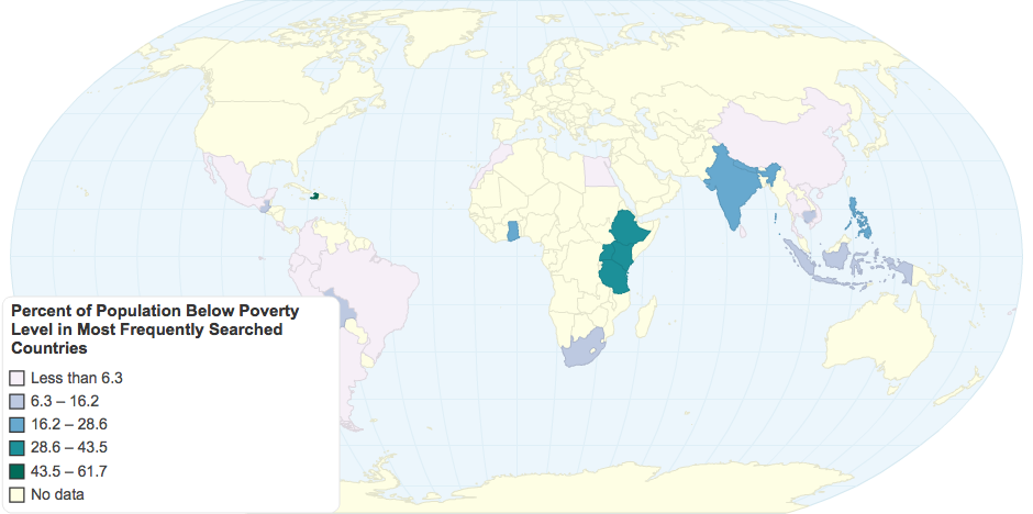 This map shows the poverty levels of the most-searched countries. According to Go Overseas 2012 Official Volunteer Abroad Report, countries ranked from 1 to 48 were the most frequently searched for volunteer programs. The high levels of searches demonstrate volunteers' interest in those countries. Notably, many of the countries that were most frequently searched did not have the highest poverty levels. For example, 87.7 percent Madagascar's population is below the poverty level, but it did not make the most-frequently-searched list. Similarly, 40.8 percent of Niger's population, 62 percent of Nigeria's population and 74.3 percent of Zambia's population fall below the poverty level. However, none of these countries were on the most-frequently-search list, indicating that other factors (besides poverty) were important to volunteers' decisions.
