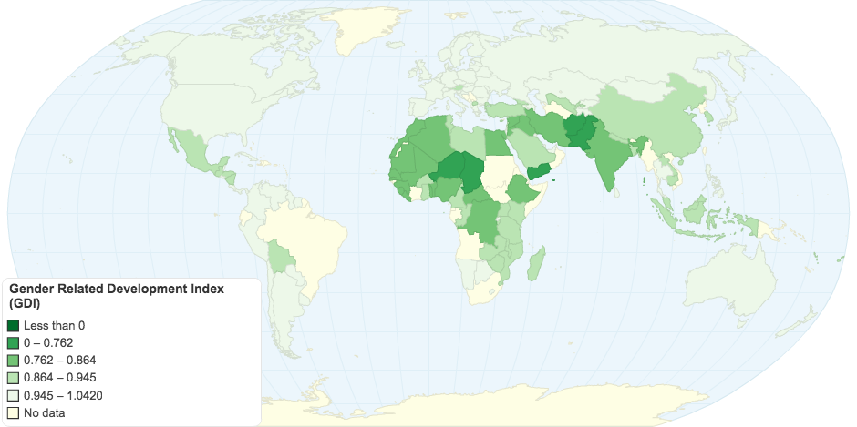 Scales the UNDP's Human Development Index by gender for 2013. The score for women as a percentage of the score for men. A value of 1 = gender equality.