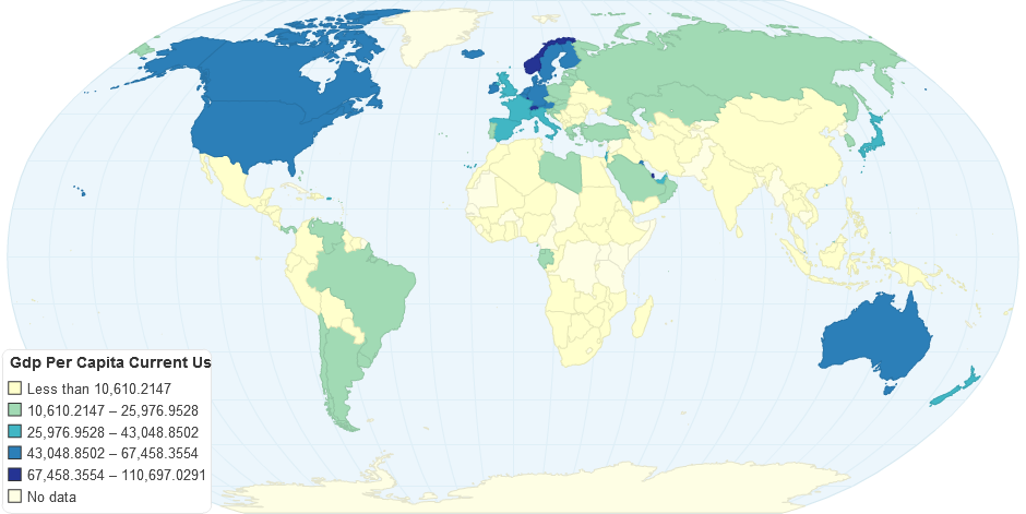 GDP per capita is gross domestic product divided by midyear population. GDP is the sum of gross value added by all resident producers in the economy plus any product taxes and minus any subsidies not included in the value of the products. It is calculated without making deductions for depreciation of fabricated assets or for depletion and degradation of natural resources. Data are in current U.S. dollars.