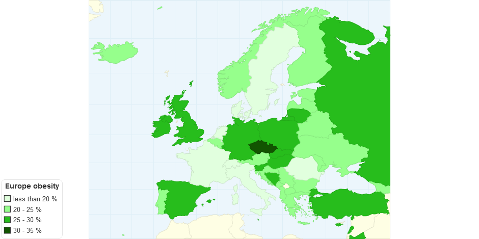 Tato mapa znázorňuje procentuální zastoupení obézních lidí v populaci evropských států k roku 2008.
