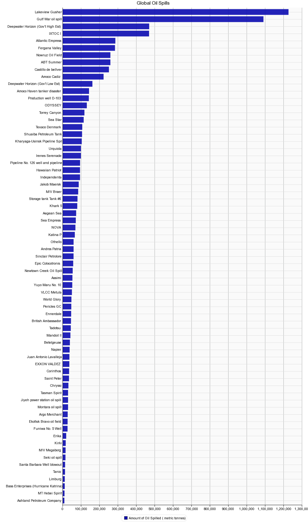 includes most oil spills, amount spilled per metric tones, affected sites, and causes of the spills.