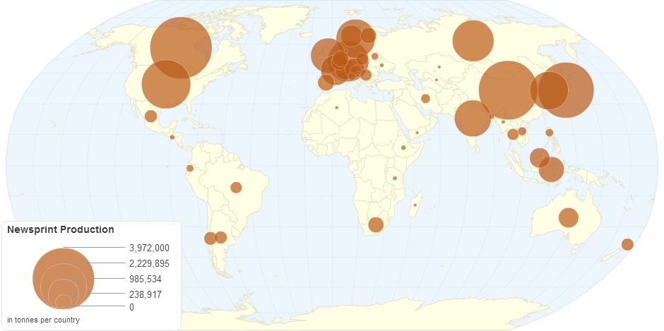 This map shows newsprint production by country.