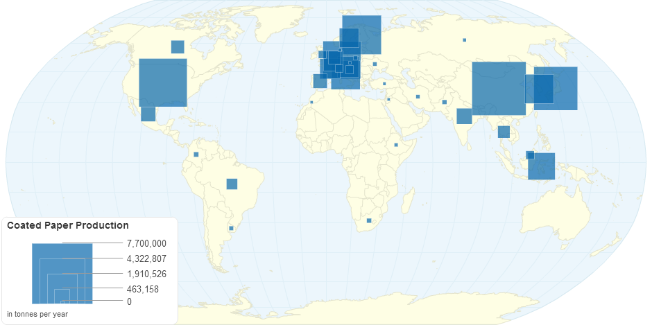 This map shows coated paper production by country.