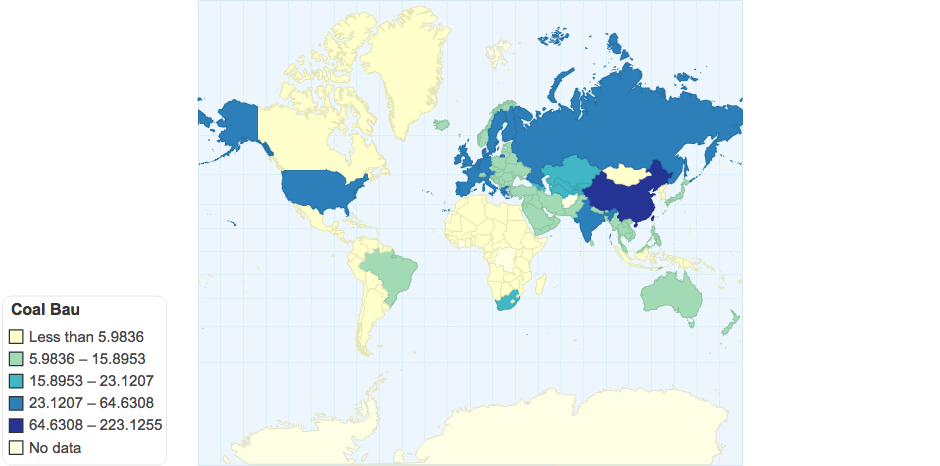 Predicted EJ of coal consumption in 2090 under a BAU scenario.
