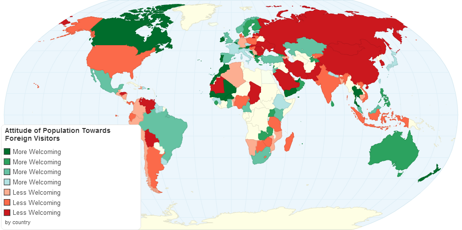 According to the data, the top three most welcoming countries for foreigners are, in order: Iceland, New Zealand and Morocco. Other high-ranking countries include the rich and peaceful of the Western world (Ireland, Canada, Austria), a few tourist havens (Thailand, United Arab Emirates), and, for some reason, big parts of West Africa.