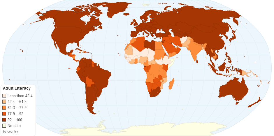 Adult (15+) literacy rate (%). Total is the percentage of the population age 15 and above who can, with understanding, read and write a short, simple statement on their everyday life. Generally, ‘literacy’ also encompasses ‘numeracy’, the ability to make simple arithmetic calculations. This indicator is calculated by dividing the number of literates aged 15 years and over by the corresponding age group population and multiplying the result by 100.