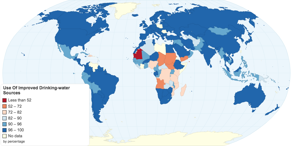This map shows Population Using Improved Drinking-water Sources by Country.