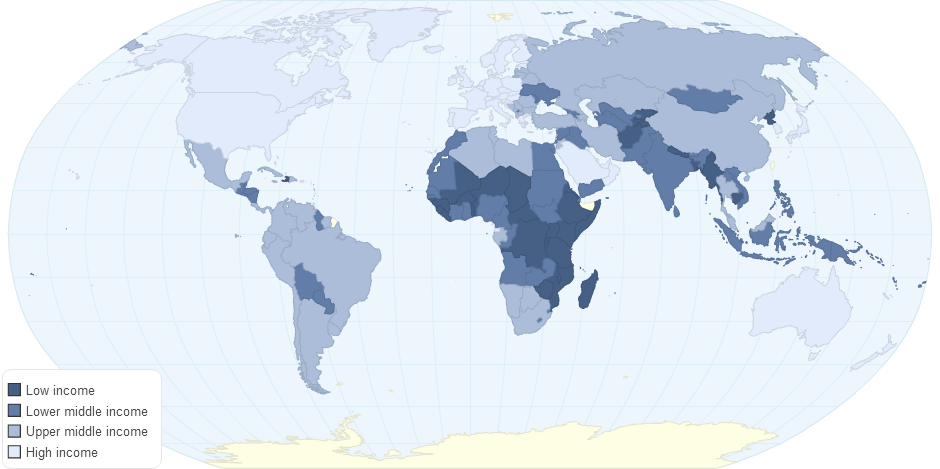 We classified countries into four income groups, based on their Gross National Income (GNI) per capita (Atlas Method) in 2010, using the 2010 World Bank classification. Low income countries are those with a GNI of 1,005 US$ or less. Lower-middle and upper-middle income countries had a GNI of 1,006 - 3,975 US$ and 3,976 - 12,275 US$, respectively. Countries with a GNI of 12,276 US$ or more are classified as high-income countries. Low and lower-middle income countries are considered to be developing economies.