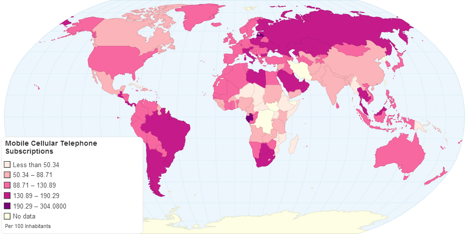 This map shows mobile cellular subscriptions per 100 inhabitants by country.