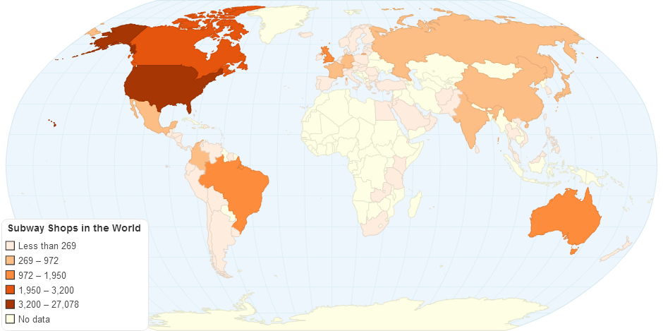 This map illustrates the distribution of Subway Shops across the globe. All data comes from: http://www.subway.com/subwayroot/ExploreOurWorld.aspx. Created by Kyle and Bita.