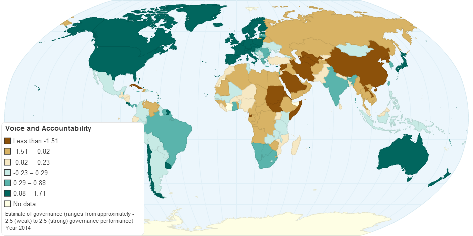 This map shows "Voice and Accountability", a dimension of governances in Worldwide Governance Indicators (WGI) project by World Bank Group, which reflects perceptions of the extent to which a country's citizens are able to participate in selecting their government, as well as freedom of expression, freedom of association, and a free media.